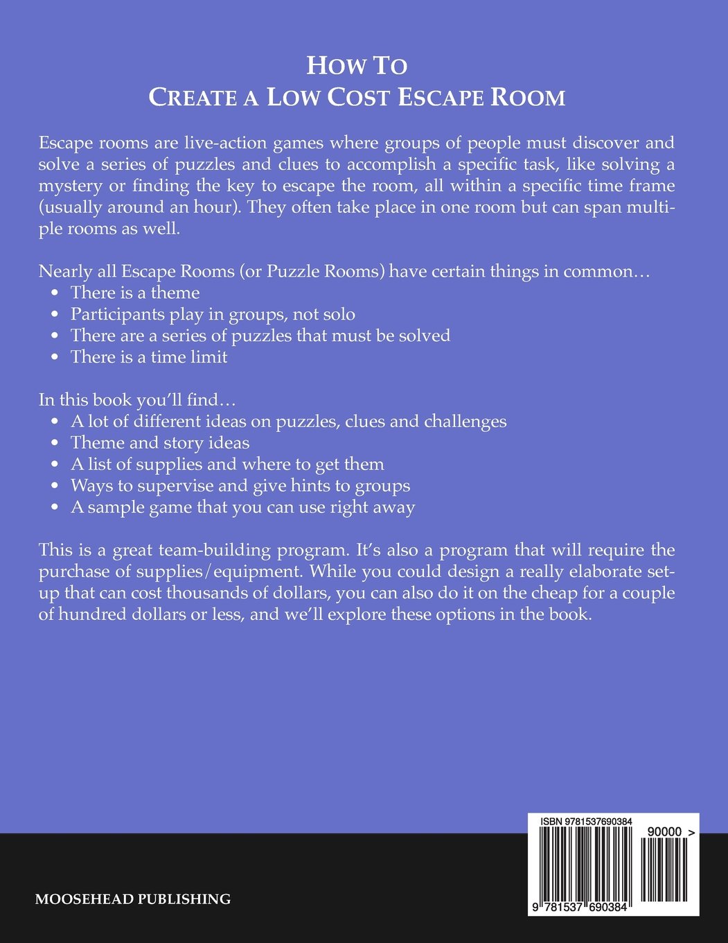 This book is designed for creating a temporary escape room for a summer camp, youth group or community center. In this book you’ll find a lot of different ideas for puzzles, clues and challenges, theme and story ideas, a list of low cost props, ways to supervise and give hints to groups, and even a sample game that you can use right away Escape Rooms (or Puzzle Rooms) can be a great team-building experience. And while you could design an elaborate set-up that cost thousands of dollars, you can also do it for just a couple of hundred dollars or less.